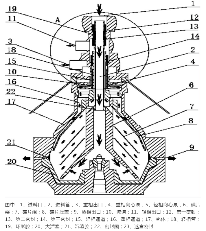用yong於yu液ye液ye分fen別bie時shi,乳ru濁zhuo液ye經jing碟die片pian束shu上shang的de進jin料liao孔kong進jin入ru各ge碟die片pian空kong地di,按an密mi度du不bu同tong分fen為wei重zhong液ye和he輕qing液ye,重zhong液ye沿yan碟die片pian內nei表biao麵mian向xiang轉zhuan鼓gu壁bi活huo動dong,輕qing液ye向xiang中zhong心xin活huo動dong,經jing溢yi流liu口kou和he向xiang心xin泵beng分fen別bie排pai出chu。