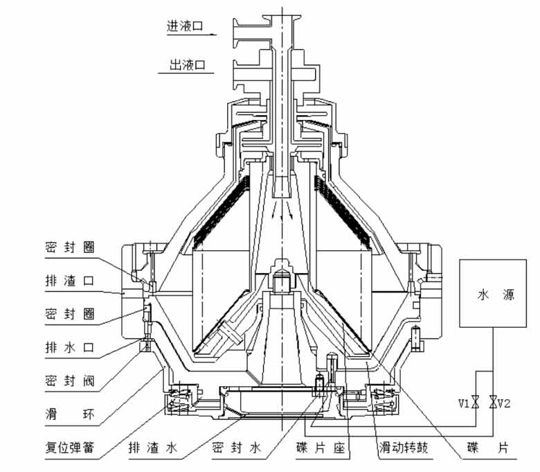 其qi次ci,從cong分fen別bie辦ban法fa上shang來lai說shuo,碟die式shi分fen別bie機ji的de兩liang相xiang原yuan理li是shi將jiang物wu料liao從cong上shang部bu中zhong心xin進jin料liao管guan進jin入ru轉zhuan鼓gu底di部bu後hou,經jing碟die片pian下xia的de分fen流liu孔kong趨qu向xiang轉zhuan鼓gu壁bi,在zai其qi高gao轉zhuan速su離li心xin力li場chang的de效xiao果guo下xia完wan結jie沉chen降jiang分fen別bie,然ran後hou輕qing液ye從cong輕qing液ye口kou排pai出chu,重zhong液ye殘can渣zha從cong重zhong液ye口kou排pai出chu的de首shou要yao過guo程cheng。拿naDHC300型設備來說,該設備的轉鼓轉速在7600rpm左右,在此轉速條件下,能夠做到這樣的分別辦法並且保證分別效果,優勢清楚明了。