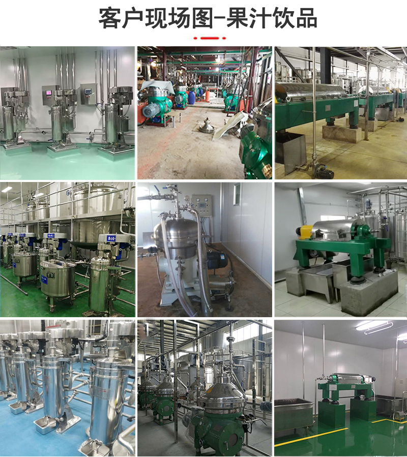 應用設備:根據果汁飲品生產工藝的不同,物料的不同參數,可適用的離心機有管式離心機、碟式離心機、臥螺離心機,其選擇依據主要有處理量、含固量、分離效果等因素。