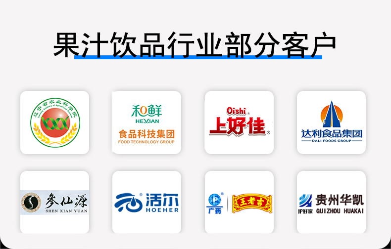 處理過的物料:果汁(草莓汁、山楂汁、沙棘果汁、橘子汁、梨汁、楊梅汁、桃子汁、藍莓汁、芒果汁、獼猴桃汁等),蔬菜汁(胡蘿卜汁、番茄汁等),果酒(葡萄果酒、草莓酒等),紅酒、黃酒、米酒、保健酒、啤酒、藥酒,豆漿、豆奶、椰奶、椰汁、杏仁露,茶(涼茶、速溶茶、功能茶、普洱茶、紅茶),咖啡