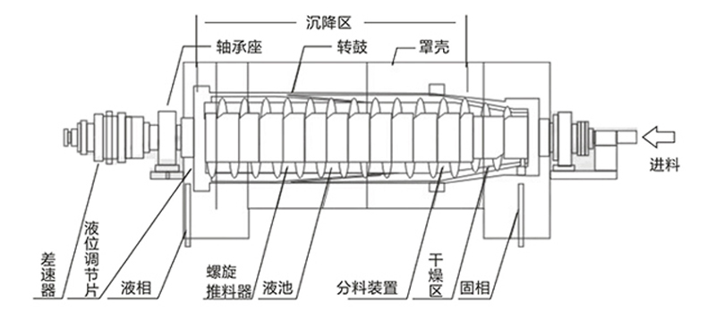 臥螺離心機是一種臥式螺旋卸料、連續操作的沉降設備。本類離心機工作原理為:轉(zhuan)鼓(gu)與(yu)螺(luo)旋(xuan)以(yi)一(yi)定(ding)差(cha)速(su)同(tong)向(xiang)高(gao)速(su)旋(xuan)轉(zhuan),物(wu)料(liao)由(you)進(jin)料(liao)管(guan)連(lian)續(xu)引(yin)入(ru)輸(shu)料(liao)螺(luo)旋(xuan)內(nei)筒(tong),加(jia)速(su)後(hou)進(jin)入(ru)轉(zhuan)鼓(gu),在(zai)離(li)心(xin)力(li)場(chang)作(zuo)用(yong)下(xia),較(jiao)重(zhong)的(de)固(gu)相(xiang)物(wu)沉(chen)積(ji)在(zai)轉(zhuan)鼓(gu)壁(bi)上(shang)形(xing)成(cheng)沉(chen)渣(zha)層(ceng)。輸(shu)料(liao)螺(luo)旋(xuan)將(jiang)沉(chen)積(ji)的(de)固(gu)相(xiang)物(wu)連(lian)續(xu)不(bu)斷(duan)地(di)經(jing)過(guo)轉(zhuan)鼓(gu)小(xiao)端(duan)的(de)幹(gan)燥(zao)區(qu)進(jin)一(yi)步(bu)脫(tuo)水(shui)後(hou)經(jing)排(pai)渣(zha)口(kou)排(pai)出(chu)機(ji)外(wai)。較(jiao)輕(qing)的(de)液(ye)相(xiang)物(wu)則(ze)形(xing)成(cheng)內(nei)層(ceng)液(ye)環(huan),由(you)轉(zhuan)鼓(gu)大(da)端(duan)溢(yi)流(liu)口(kou)連(lian)續(xu)溢(yi)出(chu)轉(zhuan)鼓(gu),經(jing)排(pai)液(ye)口(kou)排(pai)出(chu)機(ji)外(wai)。